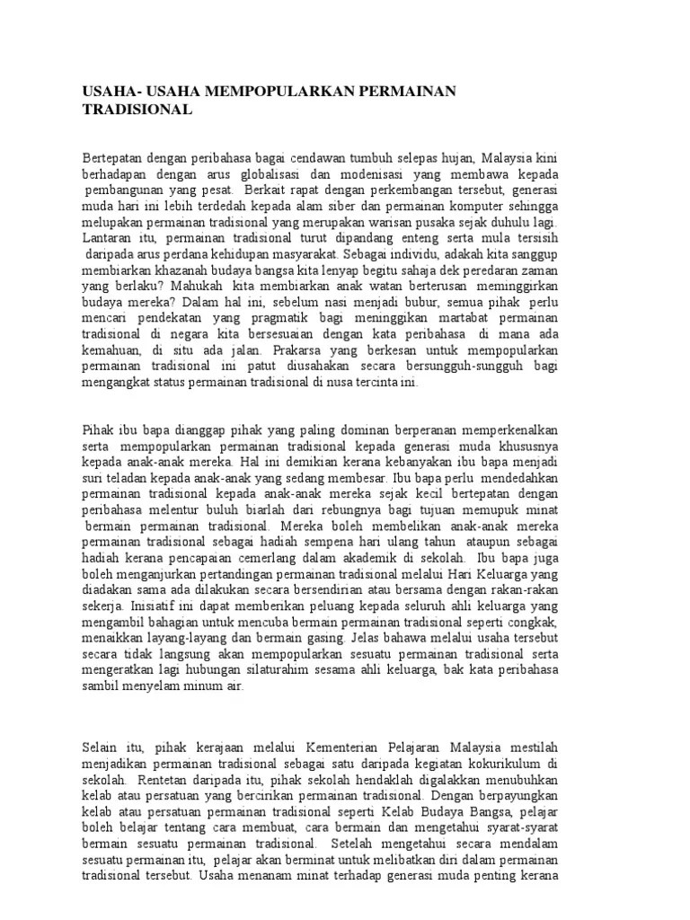 Huraikan peranan pelbagai pihak untuk . Permainan tradisional merupakan warisan bangsa yang perlu dipertahan untuk tatapan generasi akan datang. Inisiatif ini dapat memberikan peluang kepada seluruh ahli keluarga yang mengambil bahagian untuk mencuba bermain permainan tradisional seperti . Contoh karangan cemerlang pentingnya untuk terus popularkan permainan tradisional kepada .